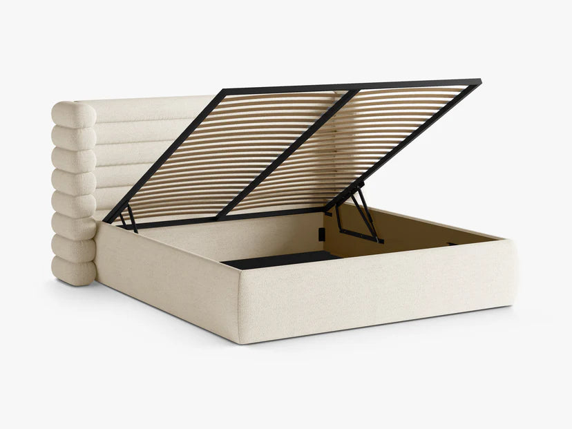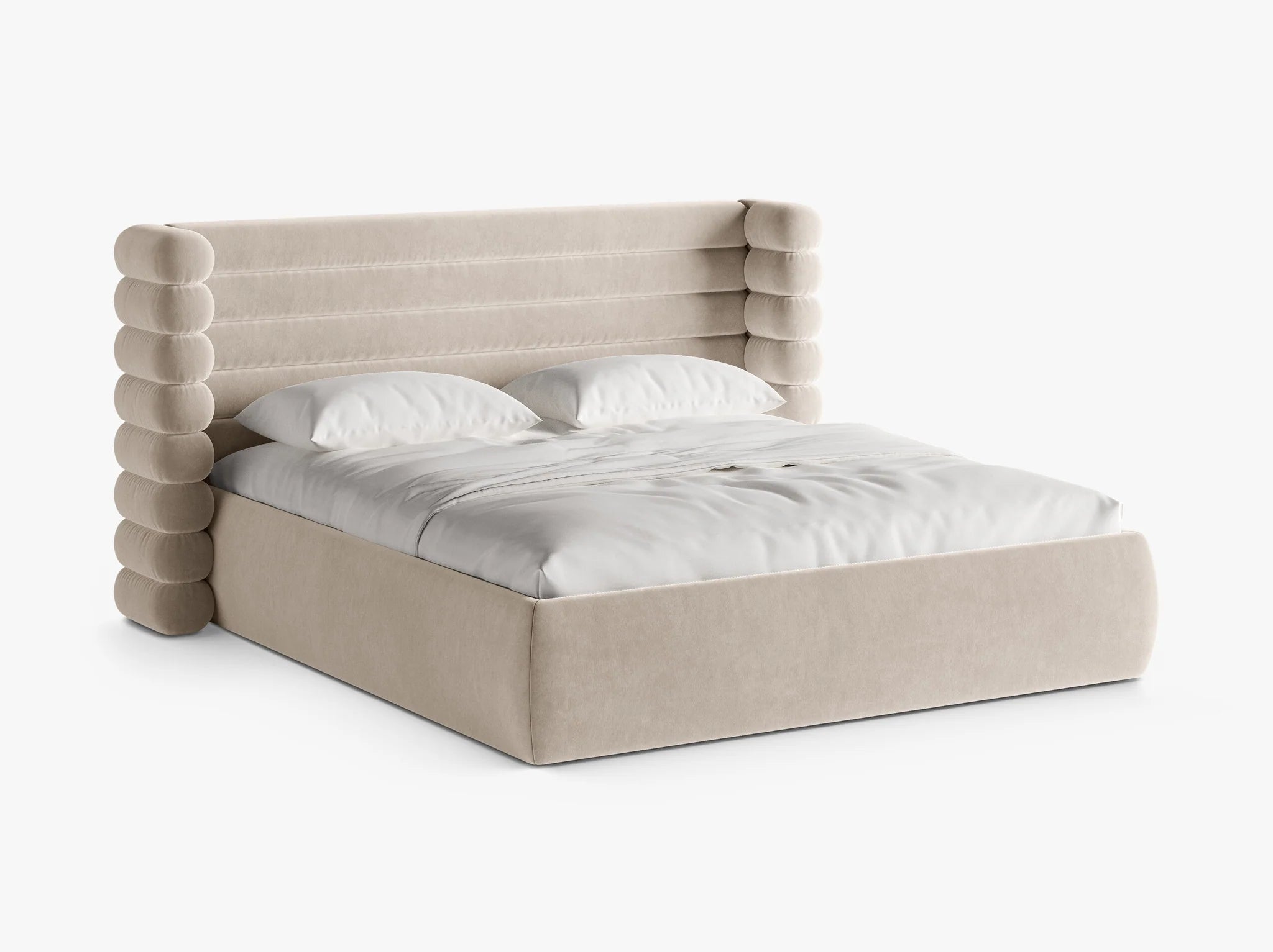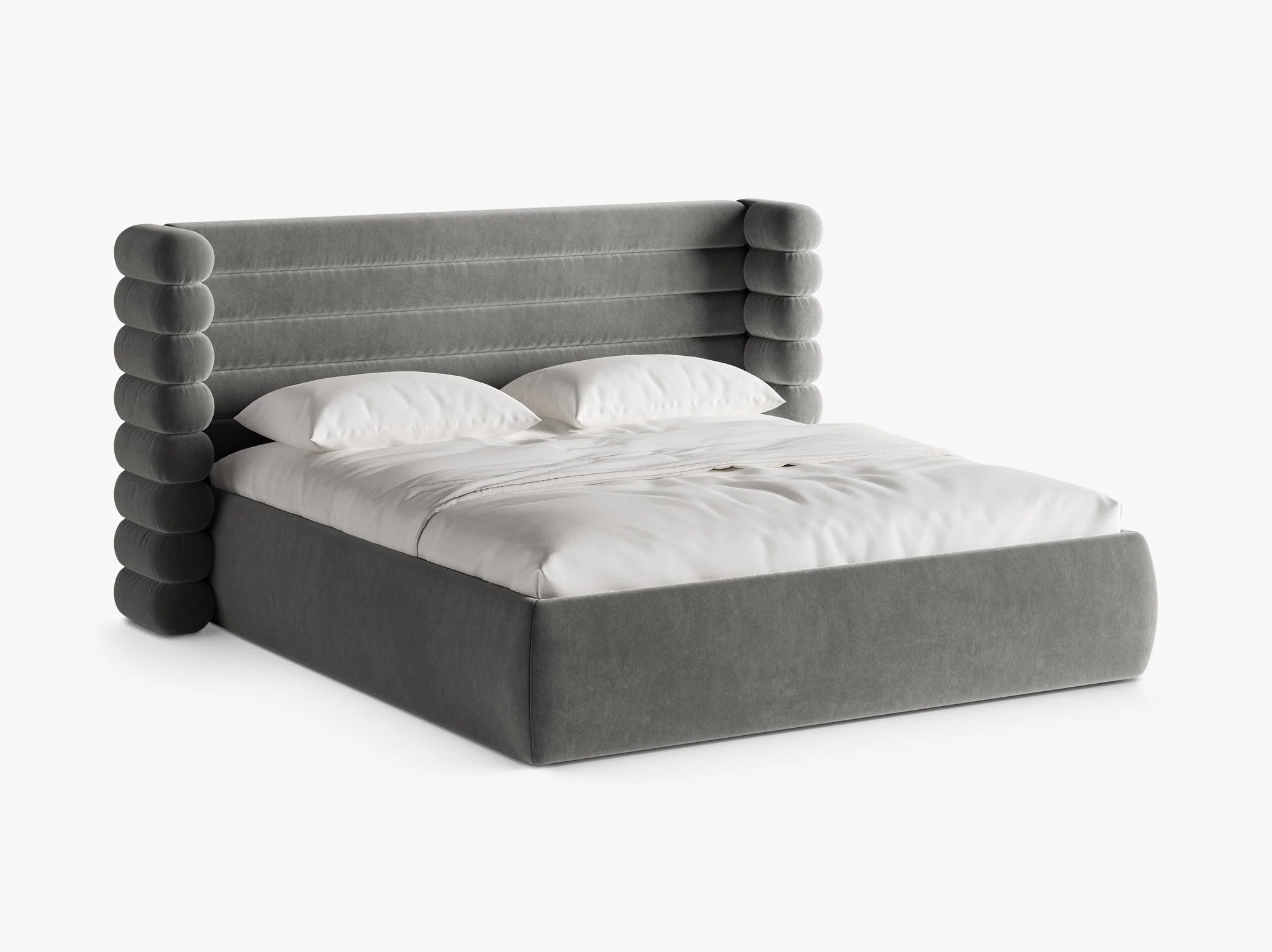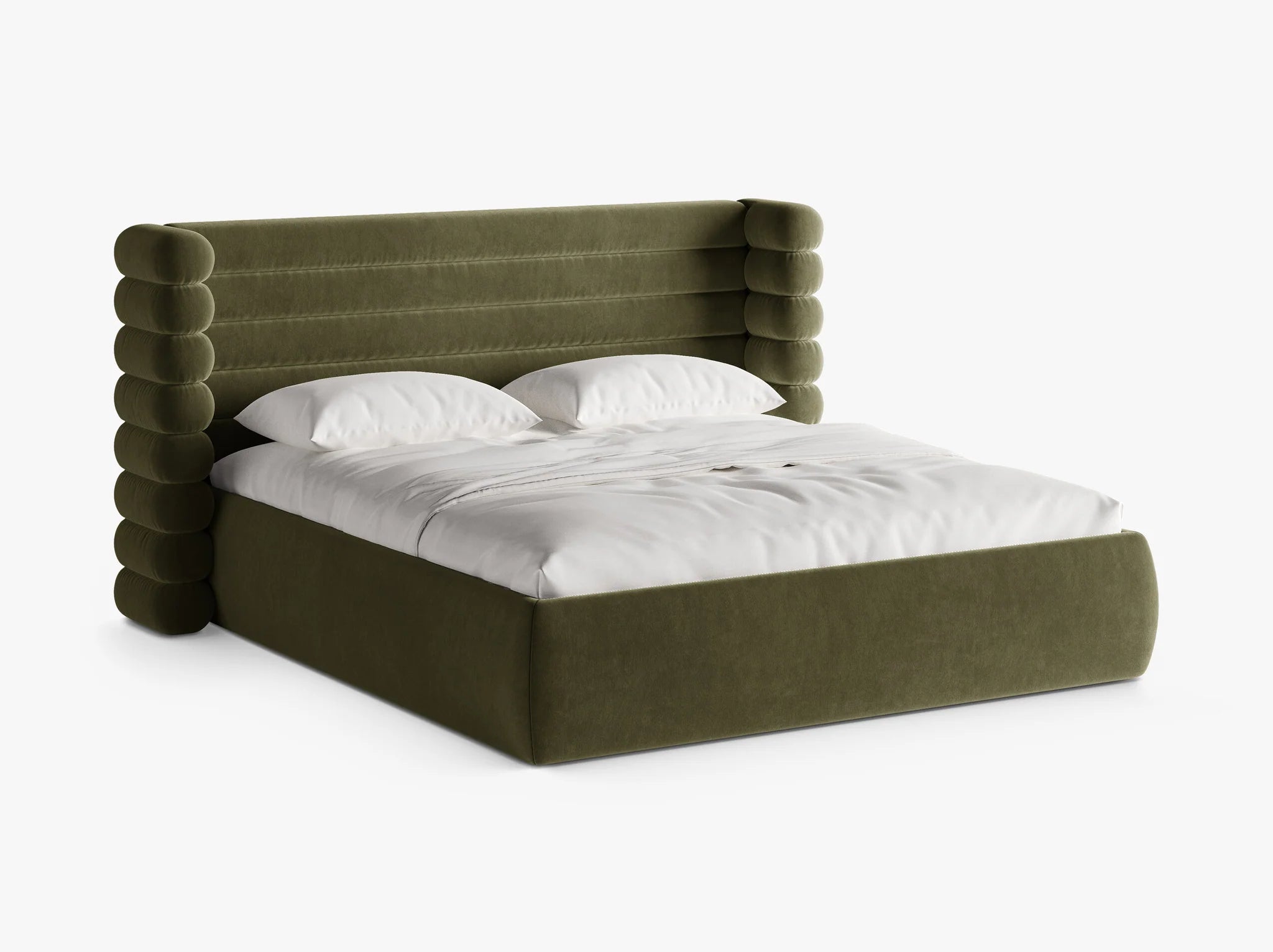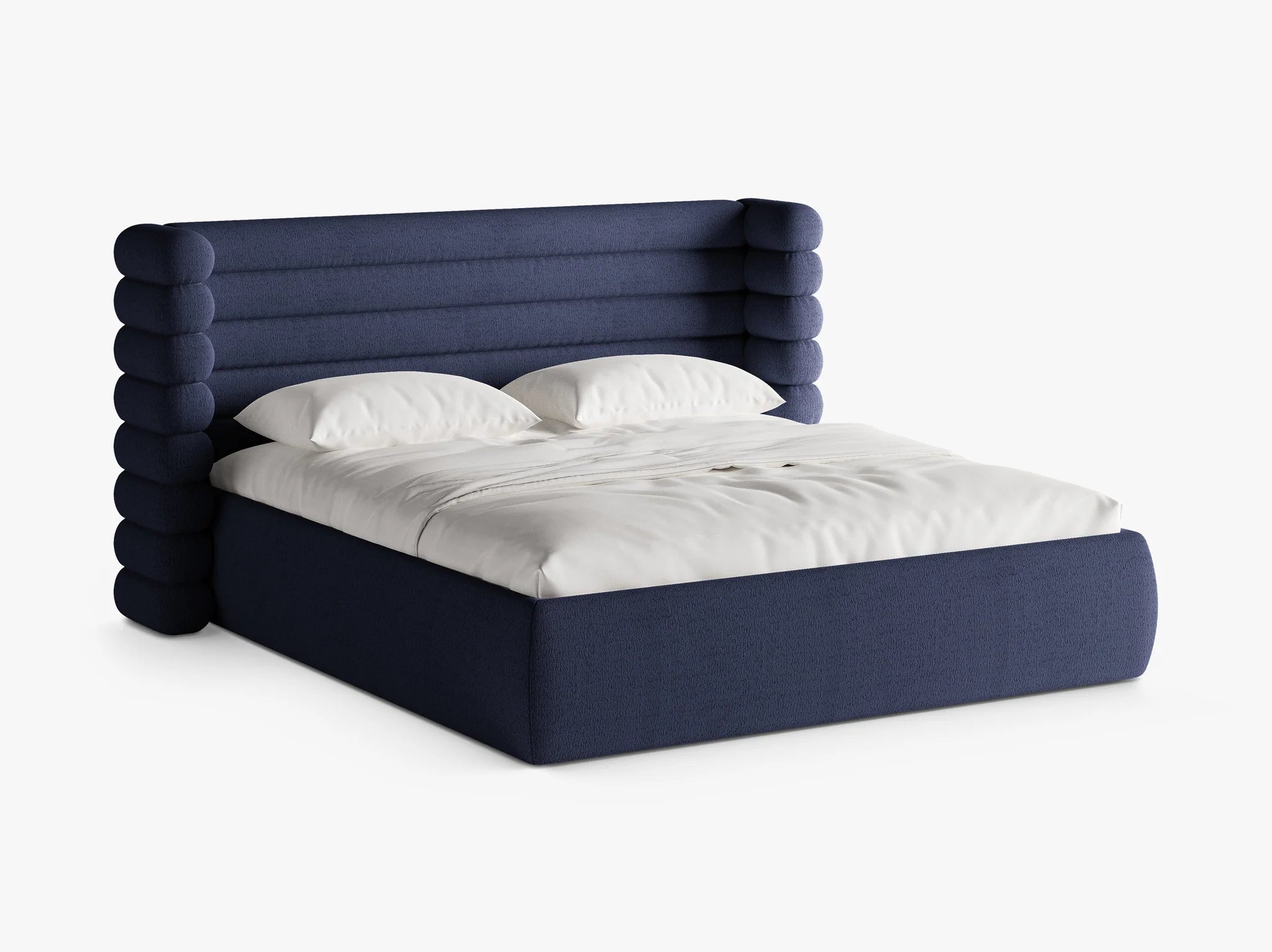 Das Bett Mount verfügt über ein skulpturales Kopfteil und einen Stauraumboden und kombiniert Komfort mit einem mutigen Design. Es ist ideal, um Ihrem Schlafzimmer einen individuellen Charakter zu verleihen.