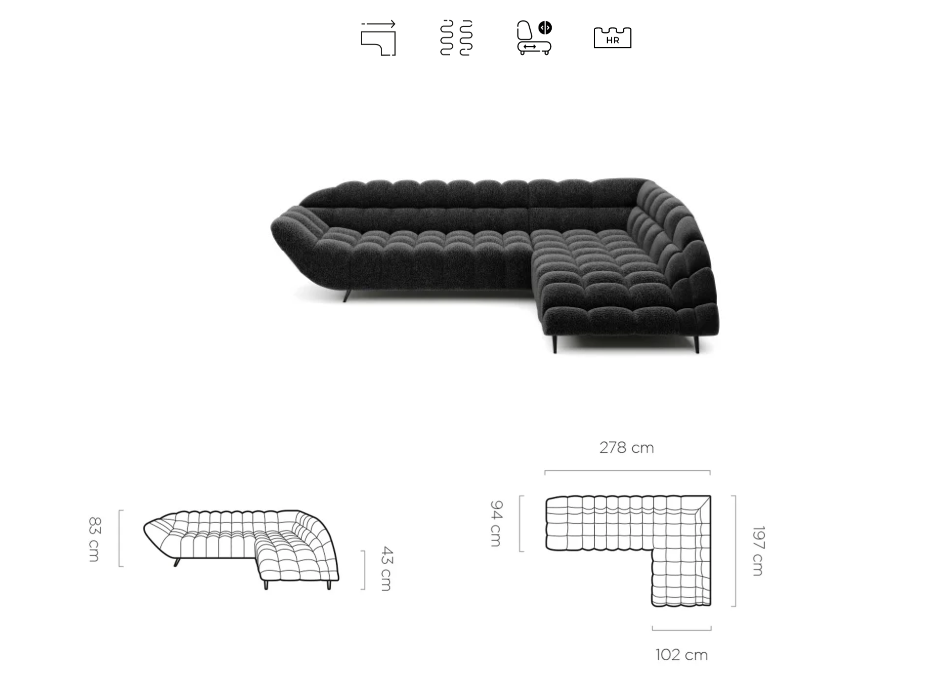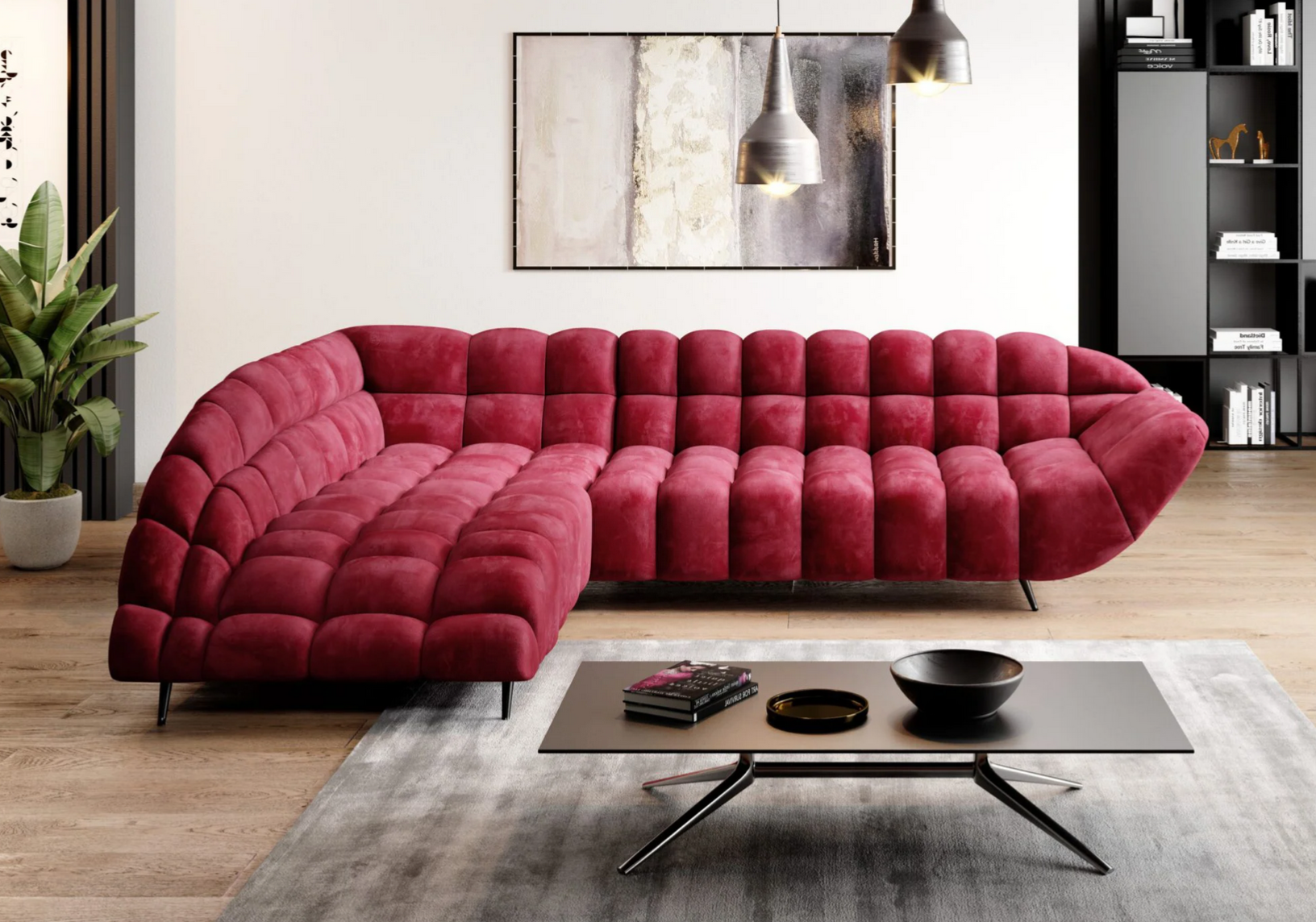 Extravagantes, modernes und äusserst bequemes Ecksofa. Ausgestattet mit einer elektrischen Sitztiefenverstellung, wodurch Sie eine bequeme Ruheposition einnehmen  können und diese an Ihre individuellen Bedürfnisse anpassen. Auf hohen Beinen, unterstreicht es die Linie des Möbels und verleiht ihm Leichtigkeit und Anmut.